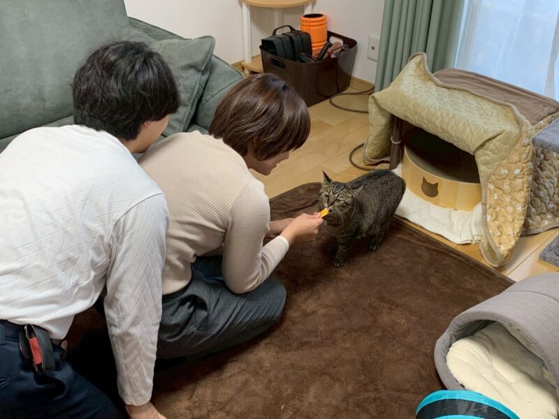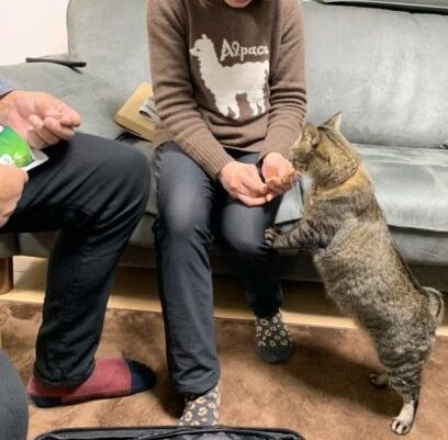 でも自分の寝床やソファの下に隠れながらも、ちゅーるを差し出されると機嫌良く寄ってきて愛想良く対応してくれました。
