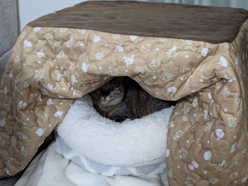 寒くなってきたので猫用コタツとその下に入れるベッドを準備しました。コタツは暑くなり過ぎないものなので、低温火傷や火事の不安が無くて安心。